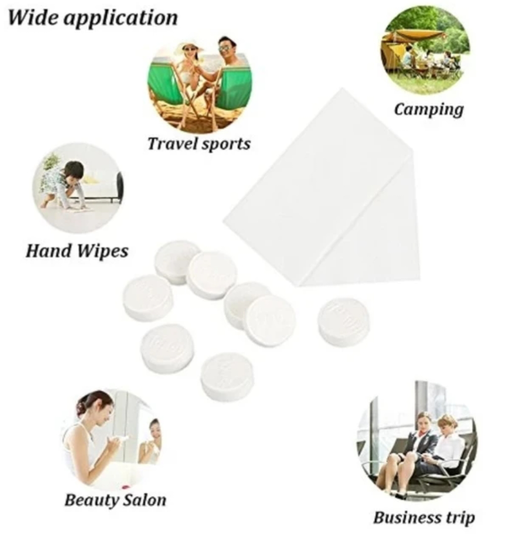 Suspaustos servetėlė-rankšluostukai. Tabletės formos, visos supakuotos atskirai,a labai patogios medvilninės servetėlės.
